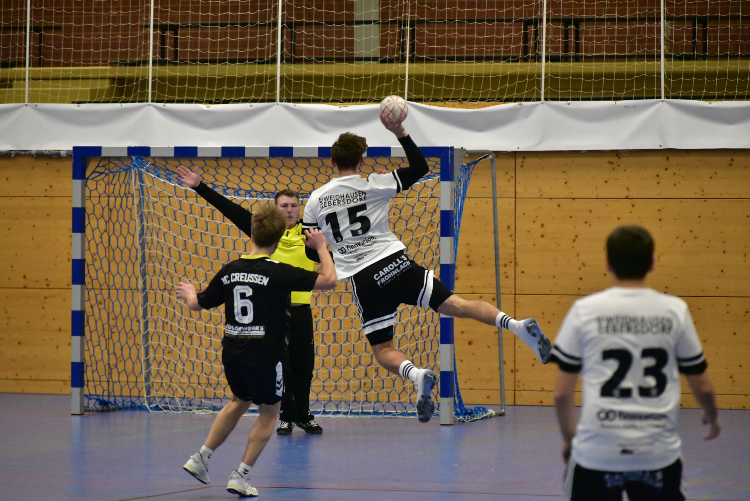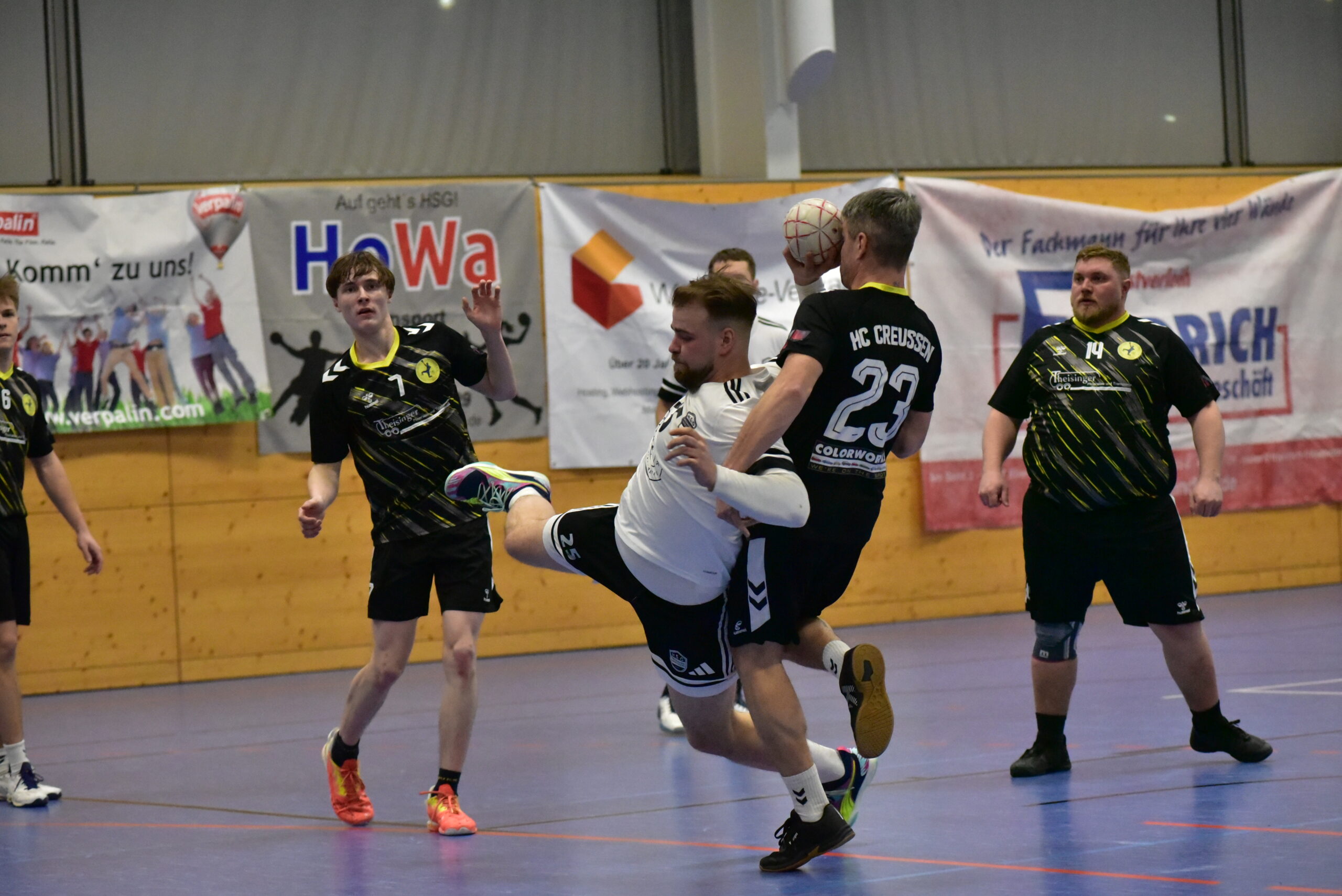 Die Mission von Herren 2 gegen den HC Creußen wurde im Vorbericht schon hinlänglich erklärt: Um in der Tabelle den direkten Vergleich zu gewinnen, müssen 8 Tore plus nach Abpfiff auf der Anzeigetafel stehen. Trainer Tobias Masching scheint seine Jungs auch gut auf dieses Ziel eingeschworen zu haben. Mit 16 Mann und breiter Brust ging man ans Werk. Die anderen Damen- und Herrenteams auf den Rängen sahen wohl zweifellos das beste Spiel der Reserve in dieser Saison. Mit einer starken Leistung von Torhüter Lennox Mehlig im Rücken erkämpften sich die Jungs eine 17:12-Führung in der Halbzeit. Das anfangs so unrealistisch erscheinende Ziel wurde dadurch immer greifbarer. Müsste ich alle Spieler aufzählen, die an diesem Tag mindestens 10 % mehr gegeben haben als in der bisher gespielten Saison, wäre die Liste wohl sehr lang. Alle, inklusive der beiden Jugendspieler Noah Haug und Toni Spichal, kämpften entschlossen. In der 44. Minute war es dann so weit: Man führte nicht nur mit 8, sondern gleich mit 9 Toren. Doch auch Creußen hatte wohl die Rechenbeispiele im Kopf und hielt noch einmal dagegen. Die HSG verlor 10 Minuten den Faden und als der Zeitmesser 59:22 zeigte, stand es „nur“ noch 30:25 für die HSG. Dann folgte der Auftritt eines Akteurs, der diese Situation schon aus seinem bisherigen Handballleben gut kannte. Mittelmann Eduard Heckel fasste sich ein Herz und brach durch: 31:25, zur Spielzeit 59:39. Anwurf Creußen, die HSG erobert den Ball und wieder ist es Eduard Heckel mit einem Kraftakt und einer riesigen Portion Schlitzohrigkeit: 32:25 mit dem Ertönen der Schlusshupe! Was das nun heißt, wird sich klären. Wir verlieren mit 7 Toren in Creußen und sie nun mit 7 Treffern in Ebersdorf. Creußen muss noch 3 Spiele spielen, wir müssen noch einmal zuhause gegen Bamberg 3 ran. Was dann am Ende der Saison drin ist, 2. Platz, 1. Platz oder sogar Entscheidungsspiele, das wird die Zukunft zeigen.