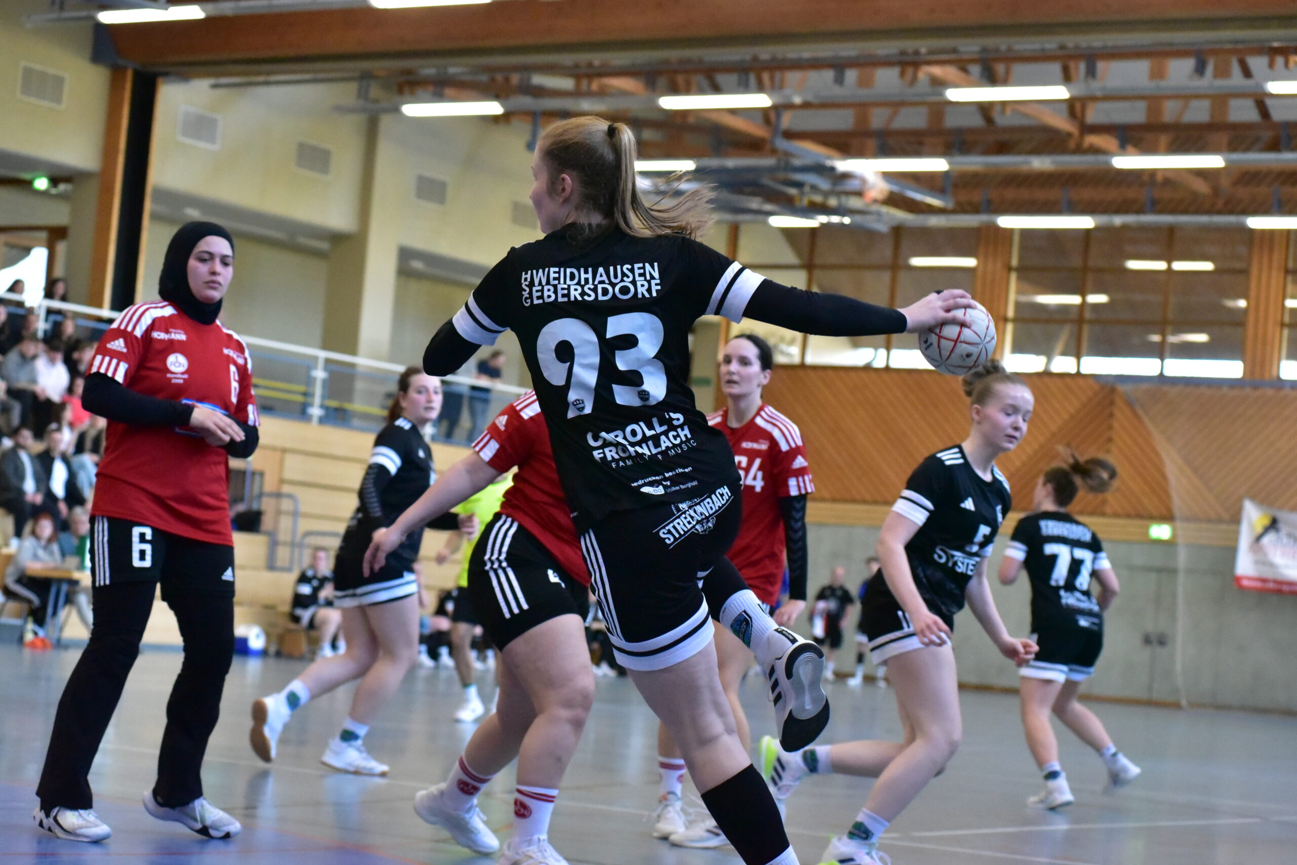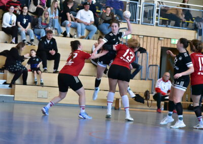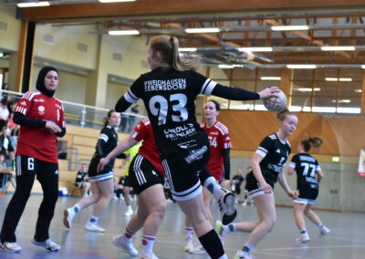 Um 14:30 Uhr griffen dann auch unsere Damen ins Geschehen an diesem Handballwochenende ein. Gegen den 1. FCN Handball sollte dann auch endlich wieder ein Sieg in Michelau an diesem Tag gefeiert werden. Die Tabellensituation in der Oberliga erzählt sich humorlos und eindeutig: „Willst du nicht sicher absteigen, dann besser keine Patzer mehr!“ Mit den Nürnbergern kamen die aktuell Tabellenletzten in die Mainfeldhalle. Eine Niederlage wäre also für unsere Mädels schon als ein „Patzer“ zu werten. Also war man schon zum Siegen verdammt. Ein Umstand, den man der HSG in der ersten Hälfte der Begegnung auch deutlich anmerkte. Zwar bot man in der Abwehr kein allzu schlechtes Spiel und Johanna Jung verrichtete gute Arbeit im Tor, jedoch wollte vorne der Ball nicht so wirklich im Netz zappeln. Mit zu überhasteten Abschlüssen und durch nervöses Angriffsspiel machten es sich die Damen in Schwarz selbst schwer. So führte der Glubb sogar mit 3 Toren in der 25. Spielminute, dann jedoch bekam Shelli Fiedler im HSG-Trikot in der Abwehr immer besser Zugriff auf die beste Torschützin der Gäste und vorne schärfte man endlich in den letzten 5 Minuten der ersten Hälfte das Visier nach. So konnte man sich zum Halbzeitpfiff noch ein 16:16-Unentschieden erkämpfen. In der Halbzeitpause fand dann das Trainergespann anscheinend die richtigen Worte und konnte dem Team die nötige Ruhe zurückbringen. Die Abwehr wurde insgesamt kompakter und vorne sollten es Feli Janusch und eine gnadenlos abschlussstarke Franzi Röschlein sein, die der HSG schnell ein komfortables Polster durch ihre Treffer ermöglichen konnten. In der Schlussviertelstunde kam es dann noch zur Premiere für Jugendspielerin Mathilda Kempf im HSG-Tor und das Team konnte einen, in der zweiten Hälfte dann doch ungefährdeten, Heimsieg feiern. Endergebnis: 36:26, wichtige Punkte im Abstiegskampf!